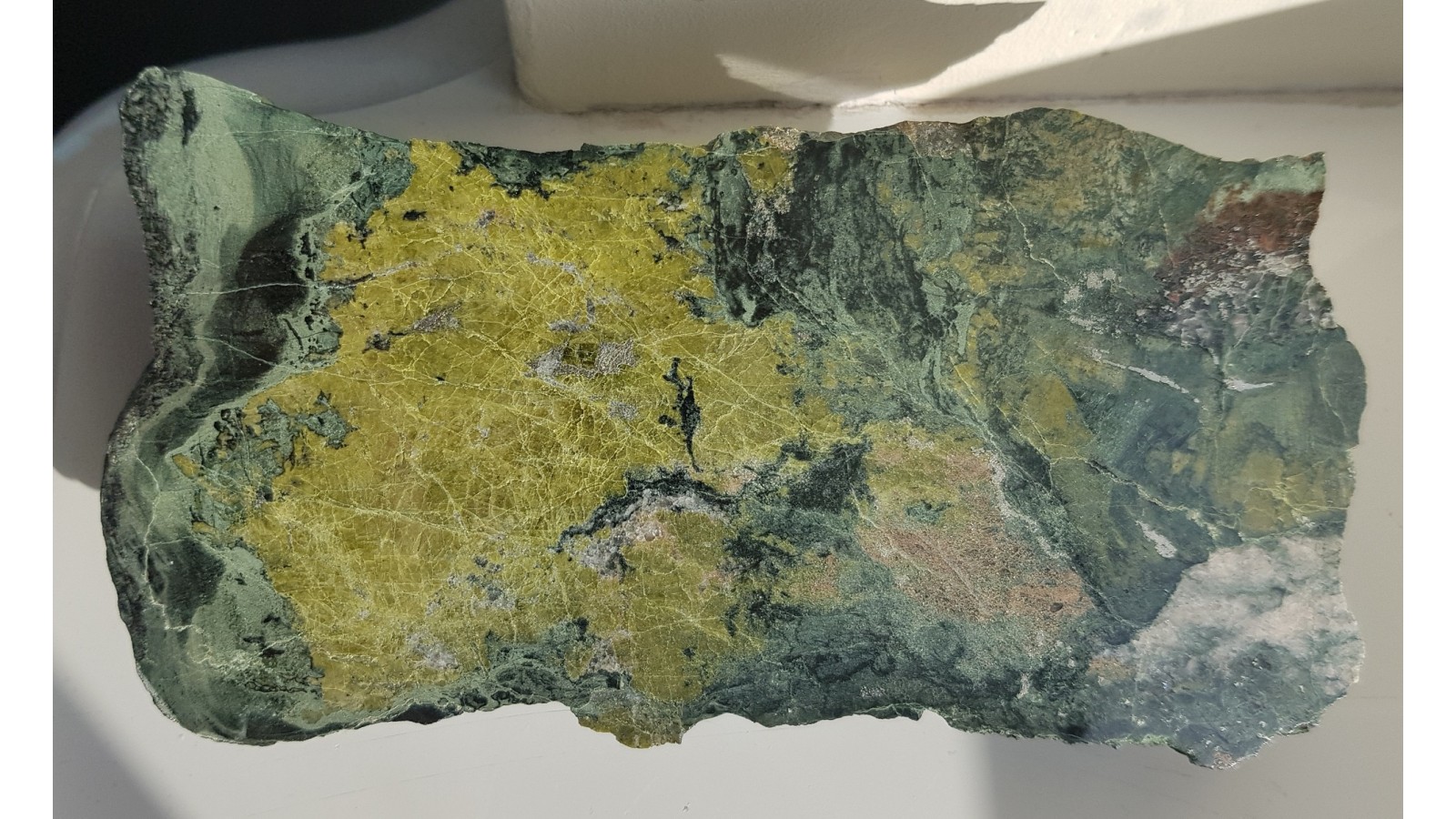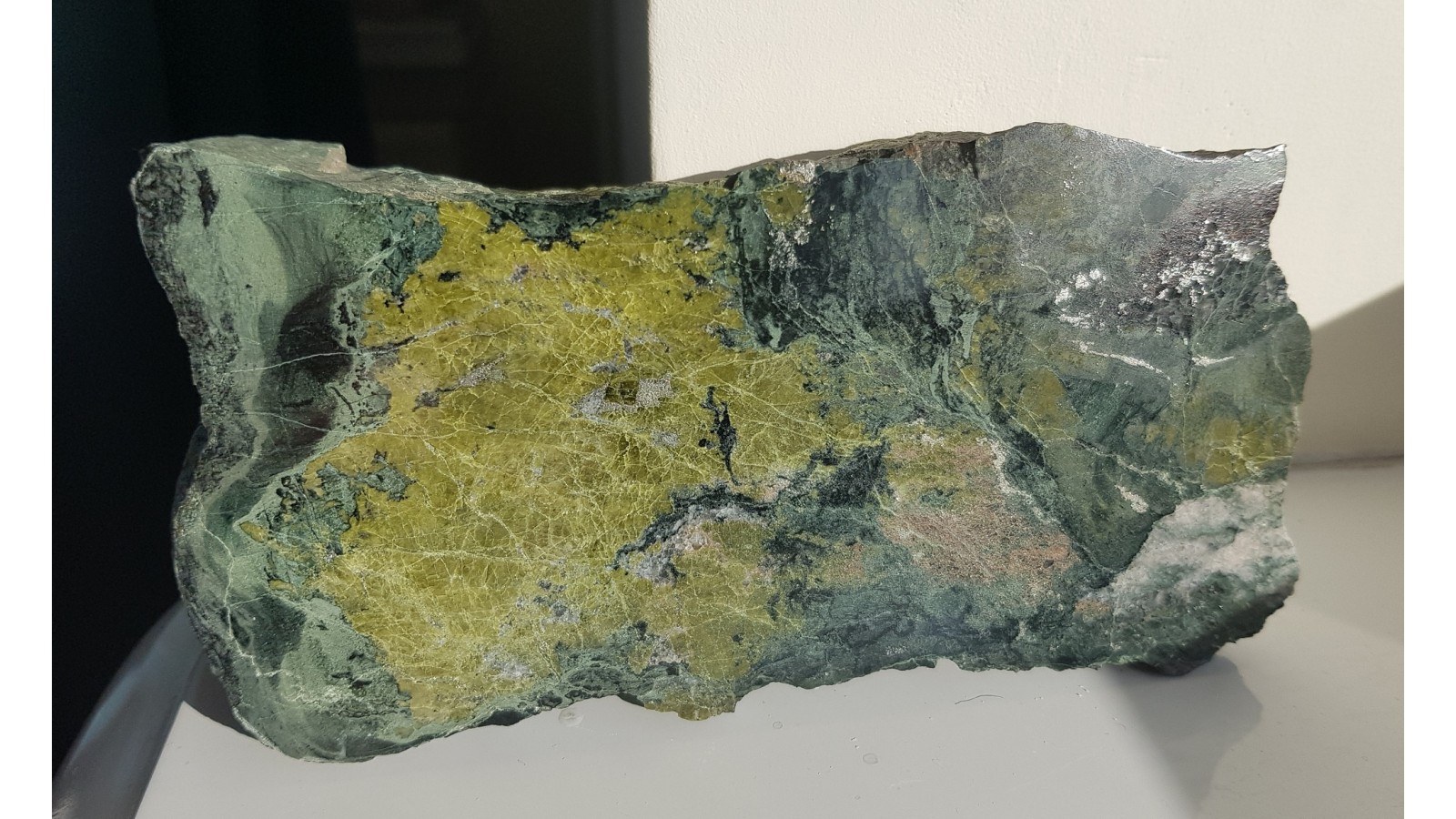 Ozdobny skarn z epidotem i pirytem z kopani rud żelaza Vulcan z Kowar. Epidot tworzy duże skupienie przerośnięte pirytem. Piękny poler, strona przeciwna naturalna, nie cięta. Bardzo efektowny okaz do kolekcji.
