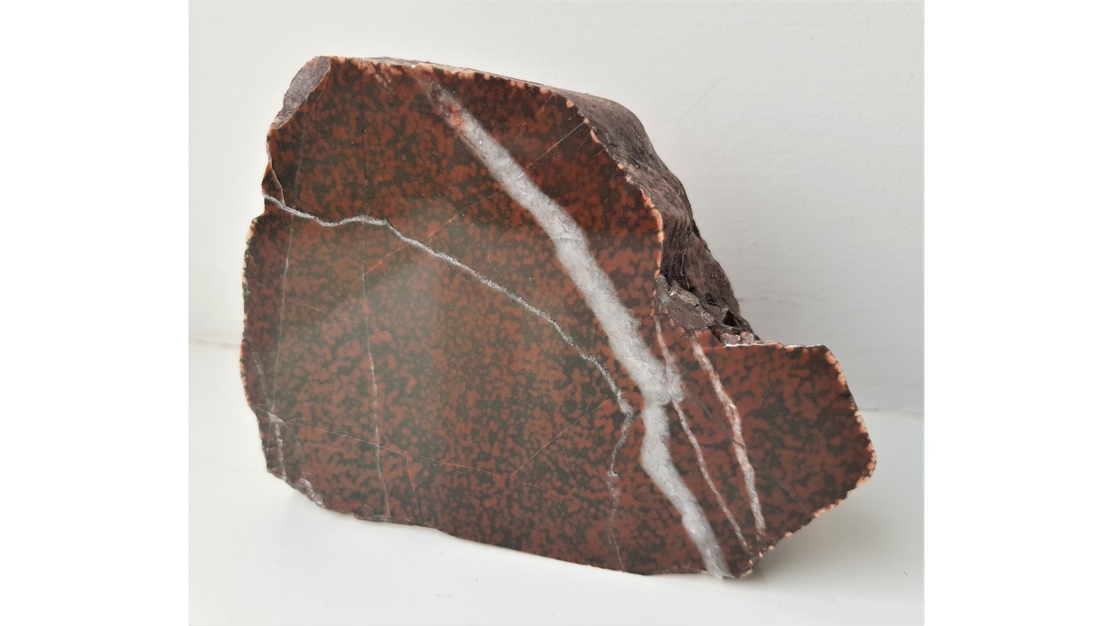 Polerowany, znacznej wielkości okaz adinolu z okolic Kamiennej Góry. Otoczaki tego rodzaju pochodzą ze zlepieńców kulmu (dolny karbon) i są sporadycznie znajdowane na polach w okolicach Kaminej Góry oraz Wałbrzycha. Adinol to skała metamorficzna, powstała na kontakcie skał osadowych oraz skała zasadowych w wyniku oddziaływania związanych z nimi roztworów hydrotermnalnych niosących sód i krzemionkę. Tworzy się w spągu skał wylewnych bądź w pobliżu hipabisalnych żył skał zasadowych. Są to skały twarde, rogowcowe, złożone głównie z kwarcu i albitu. Dawniej były opisywane przez badaczy niemieckich jako heliotropy. Bardzo świeży, niezwietrzały okaz, wyrazisty, nakrapiany i kontrastowy deseń. Strona tylna naturalna, nie cięta. Piękny okaz, świetny poler. Polecam.