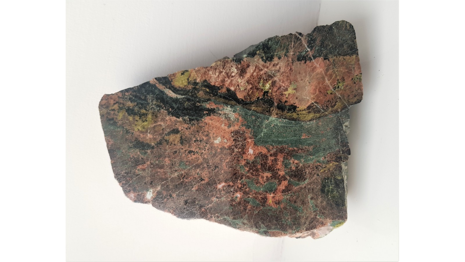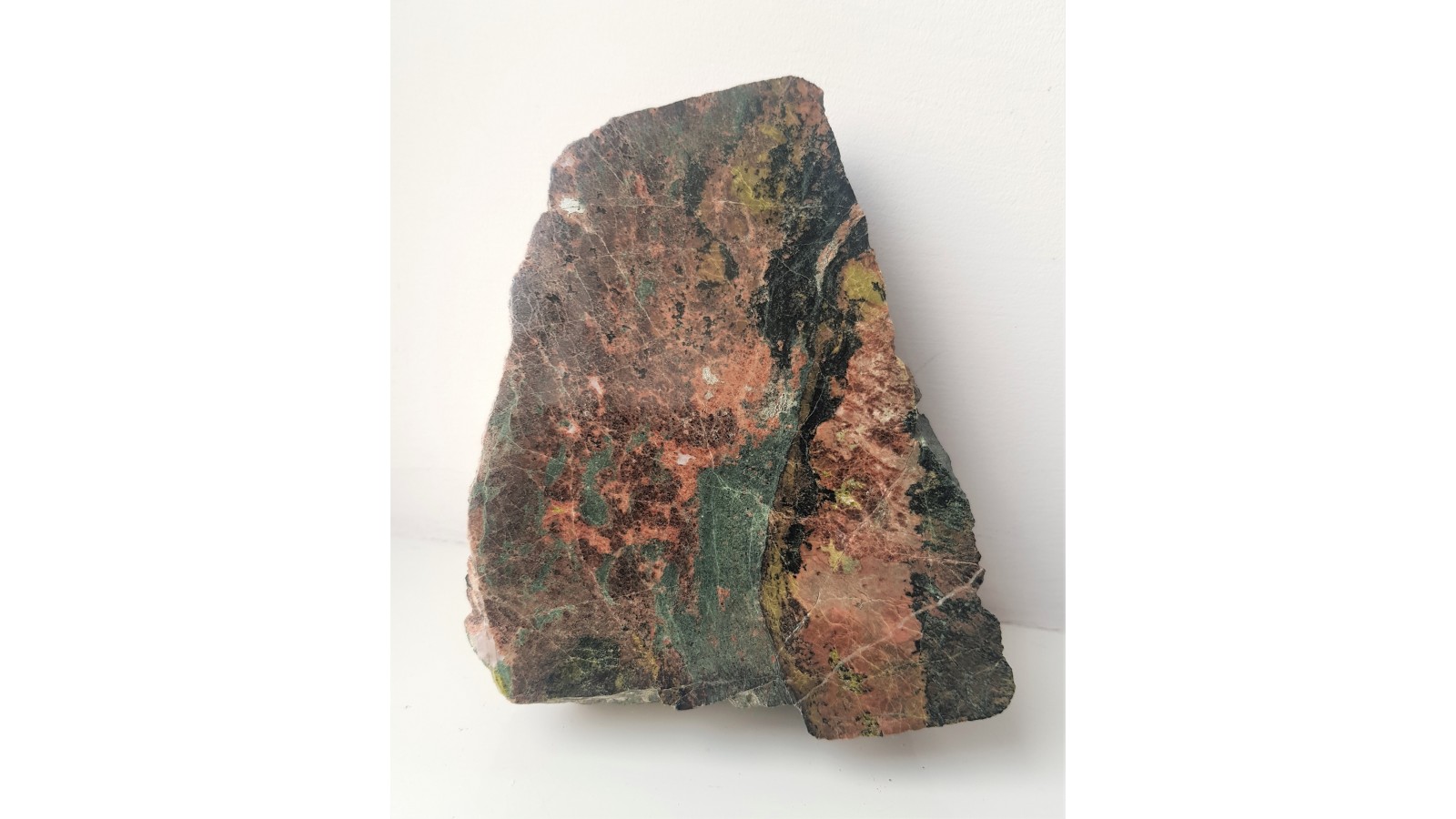 Bardzo efektowny okaz skarnu granatowo-epidotowego z widocznymi wrostkami pirytu. Doskonały poler. Duży, efektowny okaz. Strona przeciwna naturalna, z widocznymi granatami i epidotem. Piękny okaz ze złoża w Kowarach.