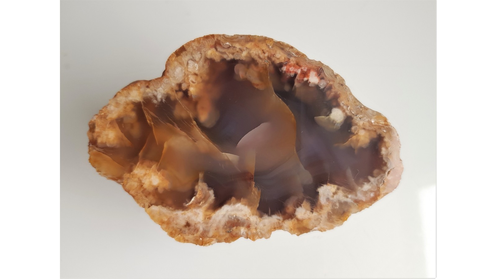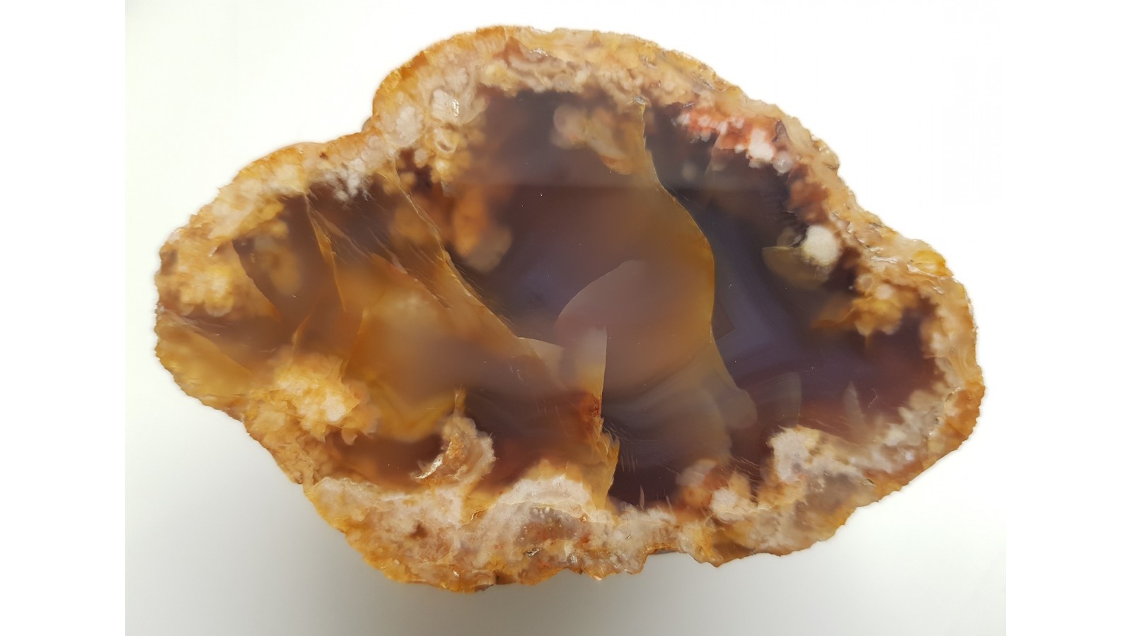 Polerowany okaz agatu z rzeki Bóbr. "Wgląd" w wnętrze okazu dzięki dużej przezroczystości chalcedonu. Widoczne mchowate formy chacedonu przy brzegach konkrecji oraz delikatne, mgliste, błękitnawe pierścienie Lieseganga. Piękny okaz, polecam.