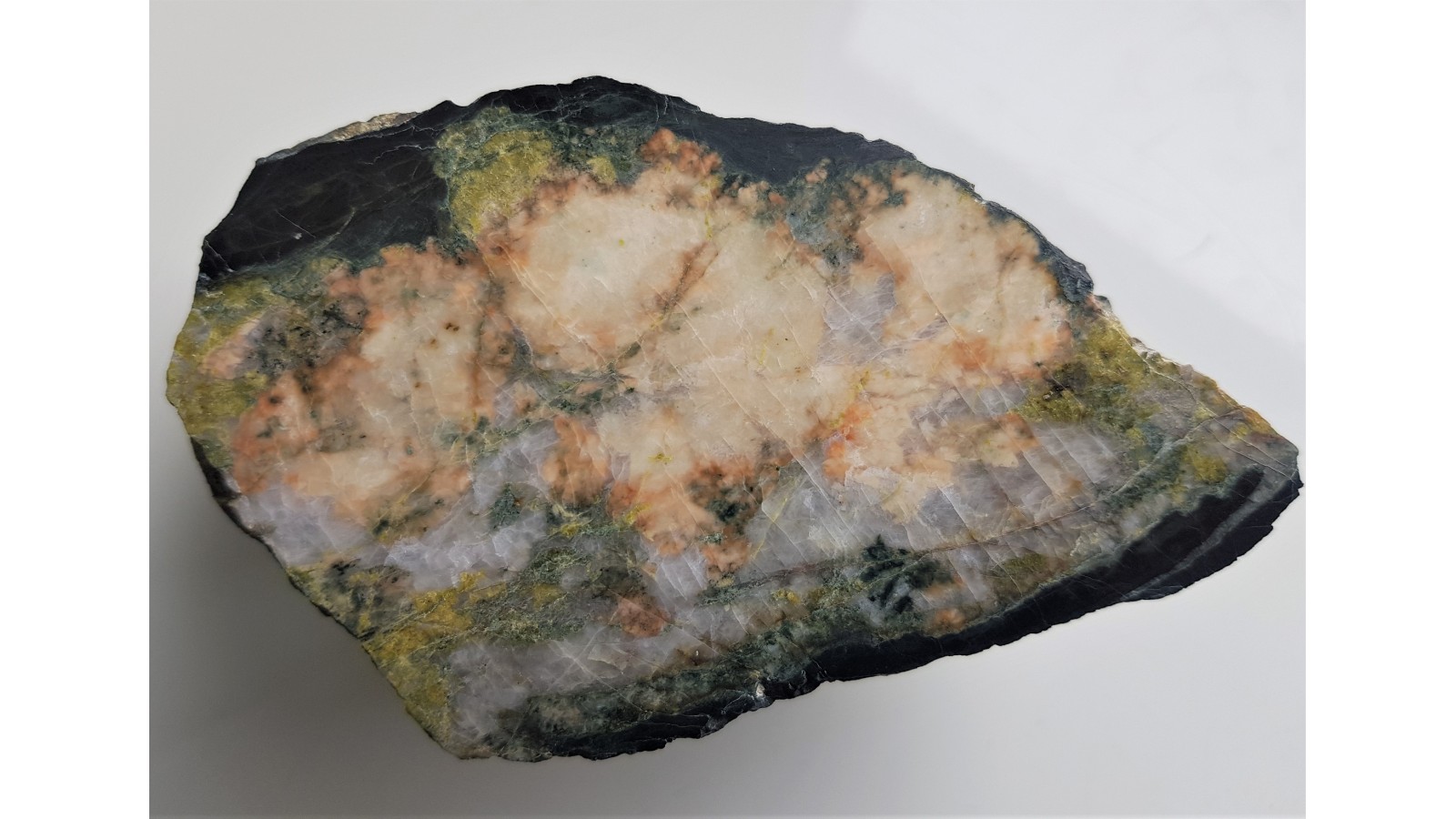 Żyłowa skała zbudowana z kwarcu, skalenia oraz pistacytu (odmiana epidotu o charakterystycznej barwie pistacjowej) z Miedzianki k. Janowic Wlk. Skały tego rodzaju sąm najprawdopodobniej związane genetyczbnie z intruzją granitów Karkonoszy o czym może świadczyć ich kwaśny, bogaty w wolną krzemionkę skład. Okaz polerowany jednostronnie o bardzo ładnych, jasnych barwach. Posiada walory ozdobne. Piękny poler, strona przeciwna naturalna. Widoczny cały przekrój żyły oraz kontakty z otaczającymi łupkami amfibolowymi. Polecam.