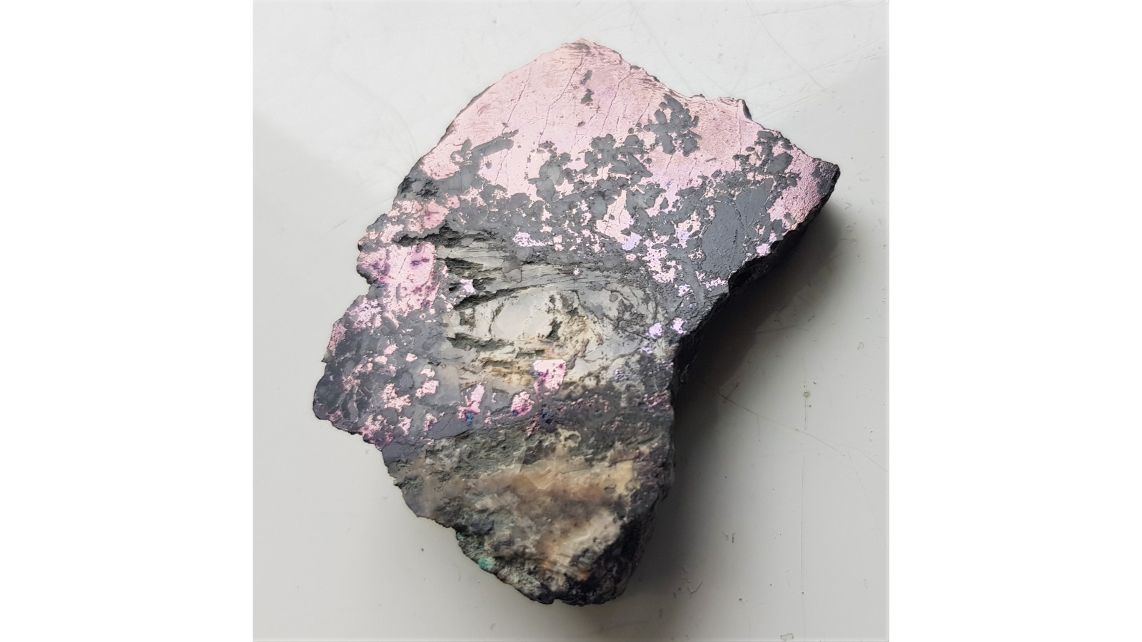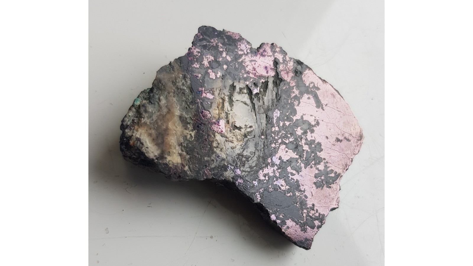 Okaz bornitu z hałdy dawnej kopalni rud miedzi w Ciechanowicach k. Miedzianki sudeckiej. Okaz z naskorupieniami malachitu po stronie przeciwnej. Na zgładzie widoczny masywny bornit oraz listewkowate kryształy barytu. Bardzo estetyczny, raczej niewielki okaz. Polecam.