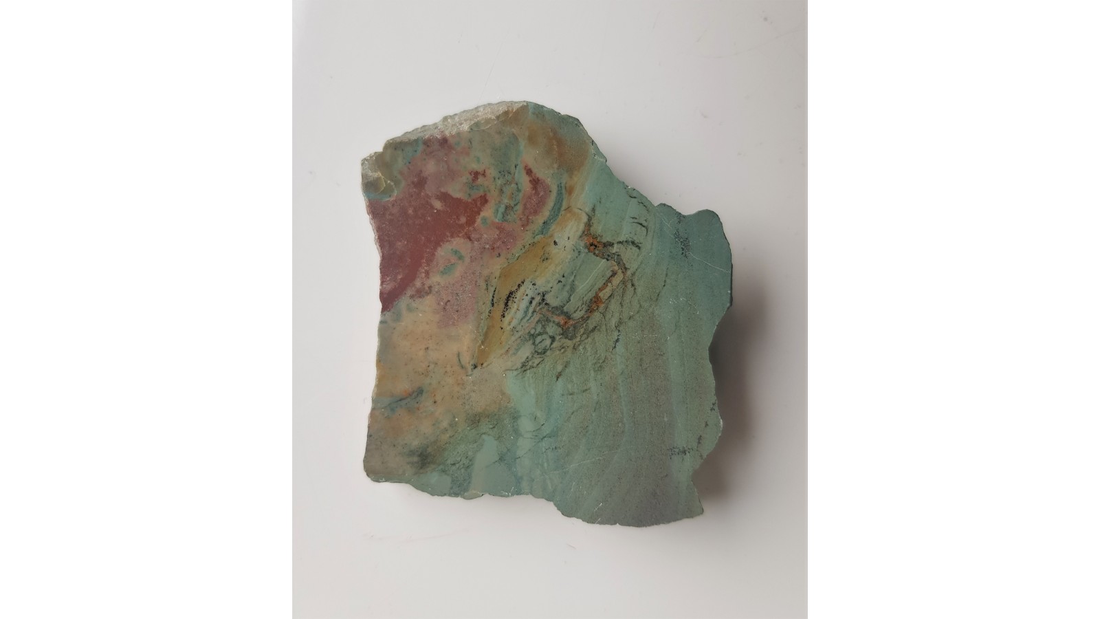Okaz polerowanego jednosteronnie jaspisoidu z Lubiechowej w Górach Kaczawskich (Sudety). Ładna płytka bez spękań i uszkodzeń. Piękna skała pejzażowa.