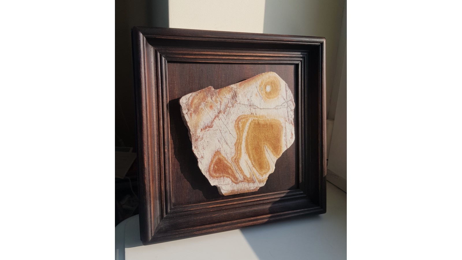 Obraz wykonany z użyciem polerowanej płytki skały pejzażowej - skały kwarcowo - serycytowej z okolic Łażan k. Żarowa z abstrakcyjnym rysunkiem. Kompozycja z natury, polecam.