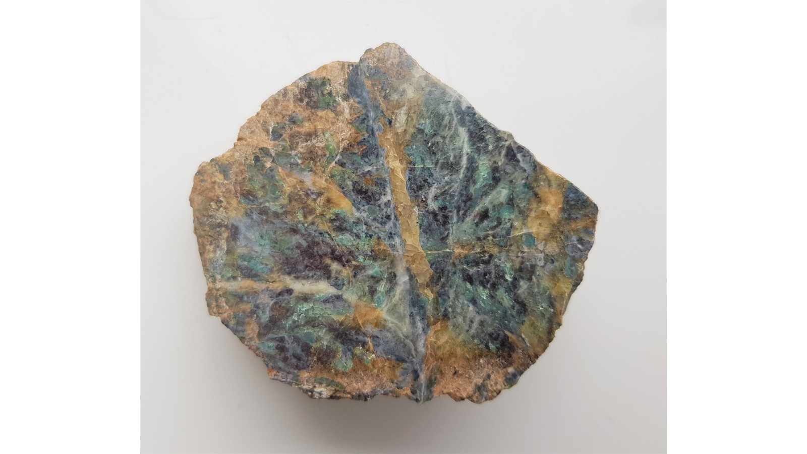 Polerowany jednostronnie okaz listwenitu z okolic Przygórza k. Nowej Rudy. Skała składa się kwarcu, węglanów, minerałów rudnych oraz zielono zabarwionych minerałów będących pozostałością po pierwotnym serpentynicie. Skała metasomatyczna wyjątkowa w Sudetach, znana głównie z Uralu.