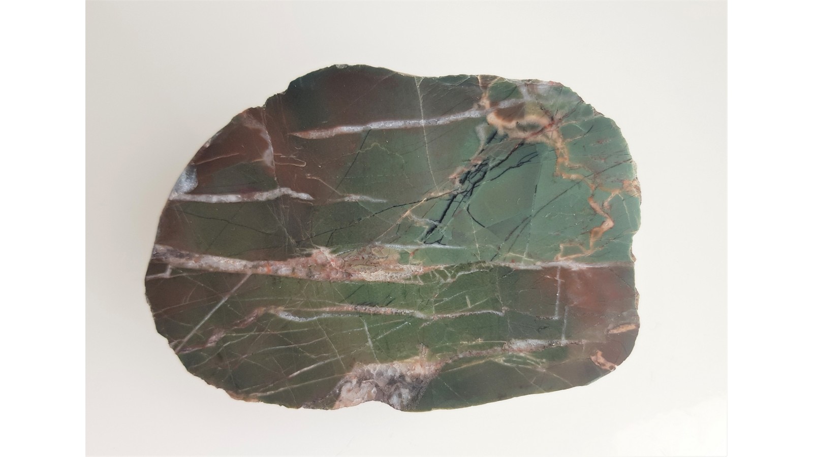 Okaz zielono-czerwonego jaspisu, rogowca z kulmu okolic Kamiennej Góry. Polerowany jednostronnie, strona przeciwna naturalna, bez cięcia. Polecam.