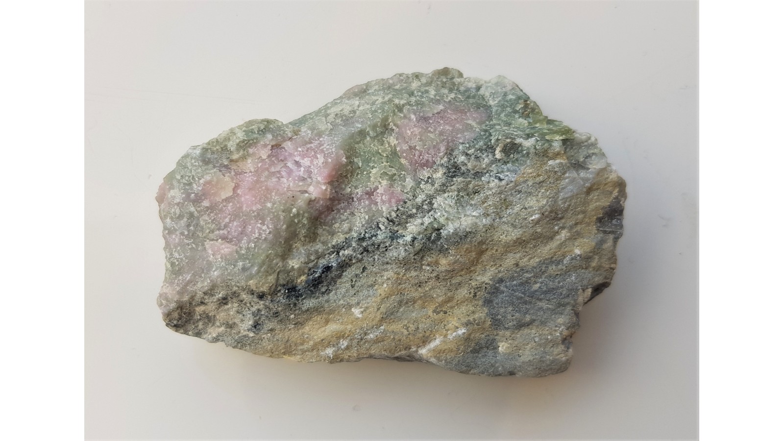 Okaz pięknie zabarwionego skarnu, najprawdopodobniej wskutek obecności różowego zoisytu. Okaz naturalny, nie cięty, nie polerowany - fragment skarnu z intensywnie różowym zoisytem. Skarn zawiera także minerały z grupy serpentynu. Polecam.