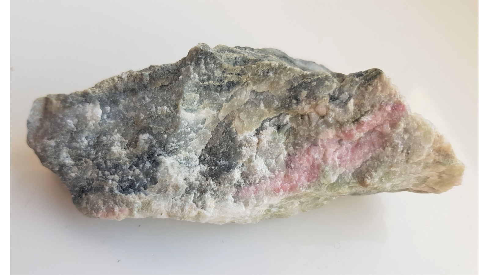 Okaz pięknie zabarwionego skarnu, najprawdopodobniej wskutek obecności różowego zoisytu. Okaz naturalny, nie cięty, nie polerowany - fragment skarnu z intensywnie różowym zoisytem. Skarn zawiera także minerały z grupy serpentynu. Polecam.