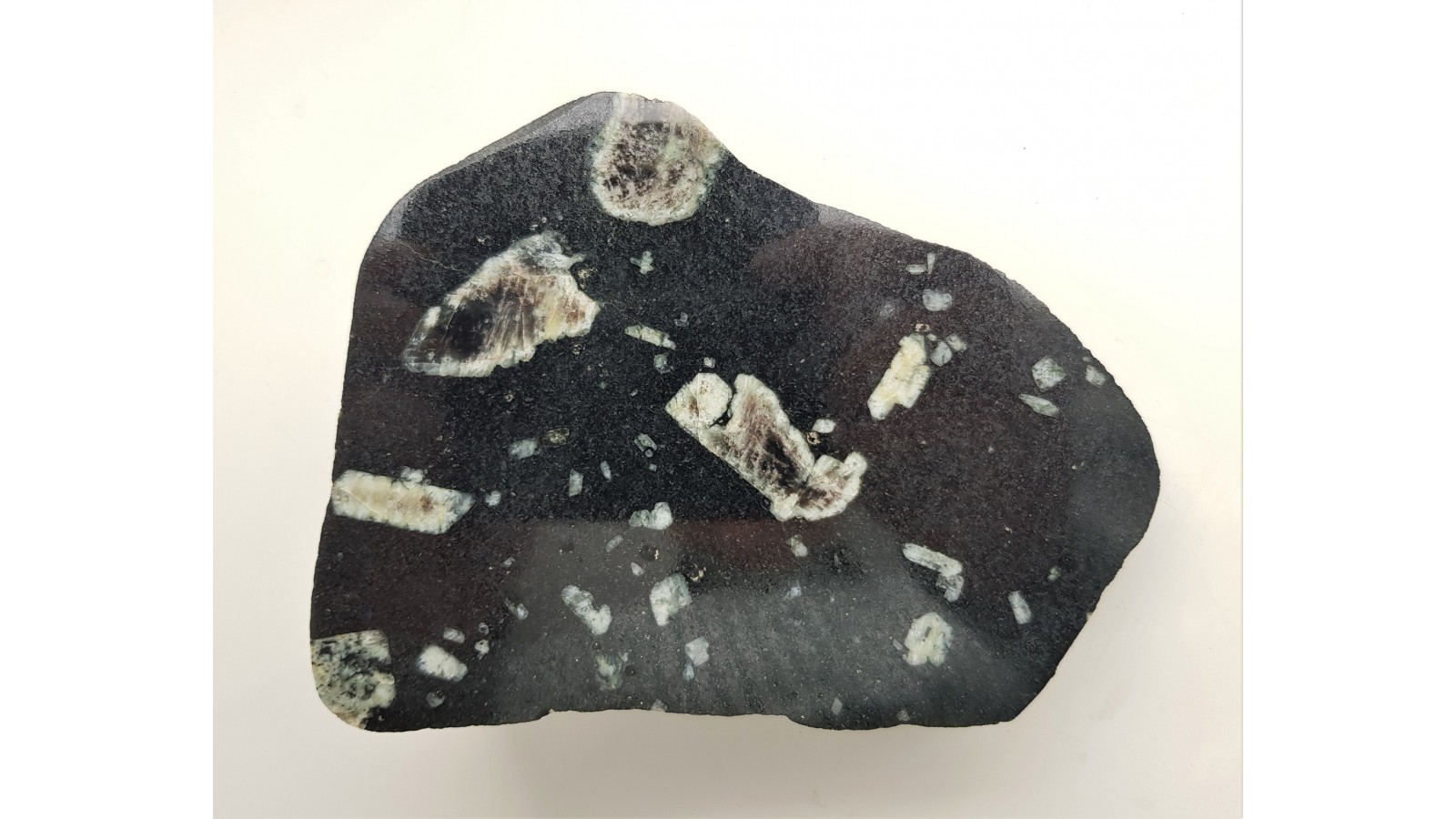 Wyjątkowy okaz diabazu z dużymi fenokryształami plagioklazów. Plagioklazy wewnątrz brązowe, ciemne, obwódkiu jasne, niemal białe. Piękny kontrast z niemal czarnym tłem skały. Eratyk, pobrzeże Bałtyku. Idealny poler, strona przeciwna naturalna - otoczak. Duży i masywny, niespękany okaz bez śladów nadwietrzenia. Polecam.