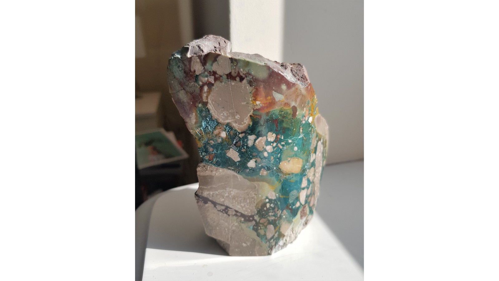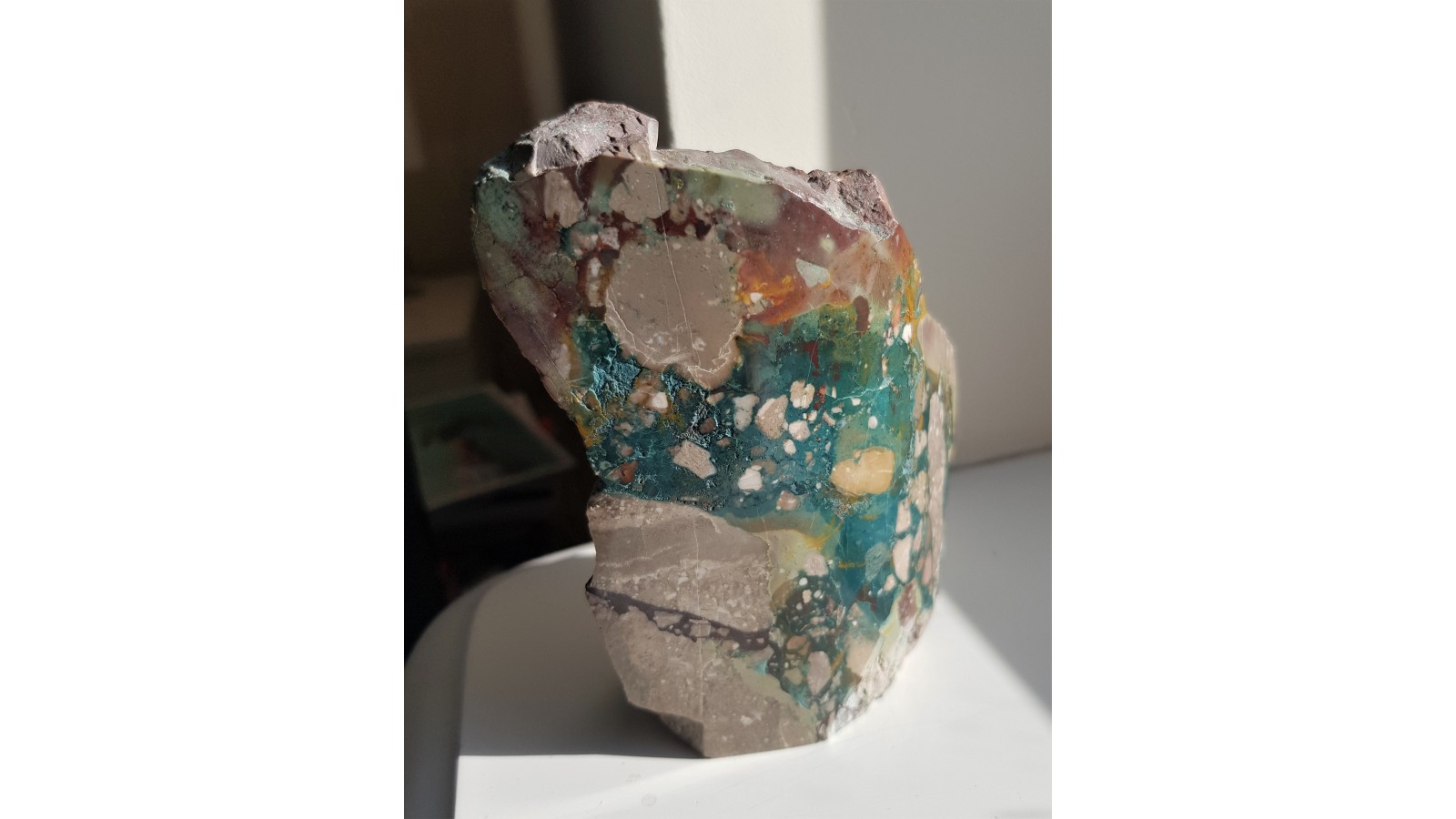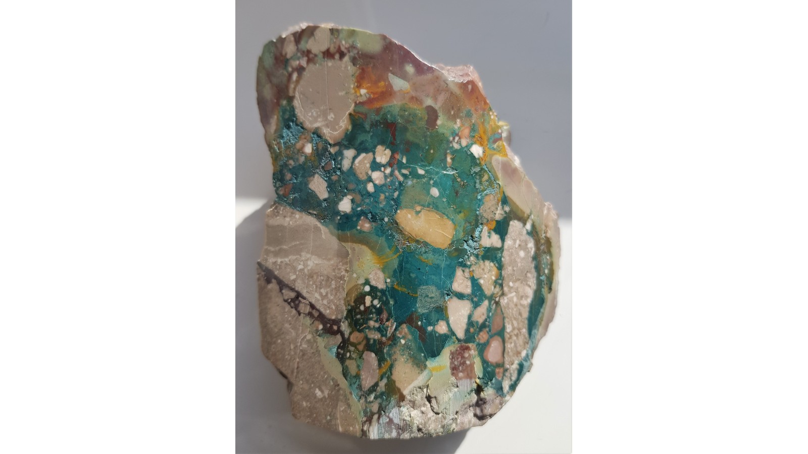 Niezwykły z uwagi na intensywność i nasycenie barw oraz pozycję geologiczną jaspis z Małego Kaukazu w Azerbejdżanie. Jaspis wypełnia wolne przestrzenie w brekcji złożonej z osadowych wapieni ze skamieniałościami. Barwy jaspisu od zielononiebieskiej do czerwonej przez ochry. Piekny, niezwykle ozdobny okaz. Widoczna strefa brekcji - kontekst geologiczny okazu. Okaz szlifowany na obło. Idealny poler. Piękny okaz i obiekt ozdoby. Polecam.
