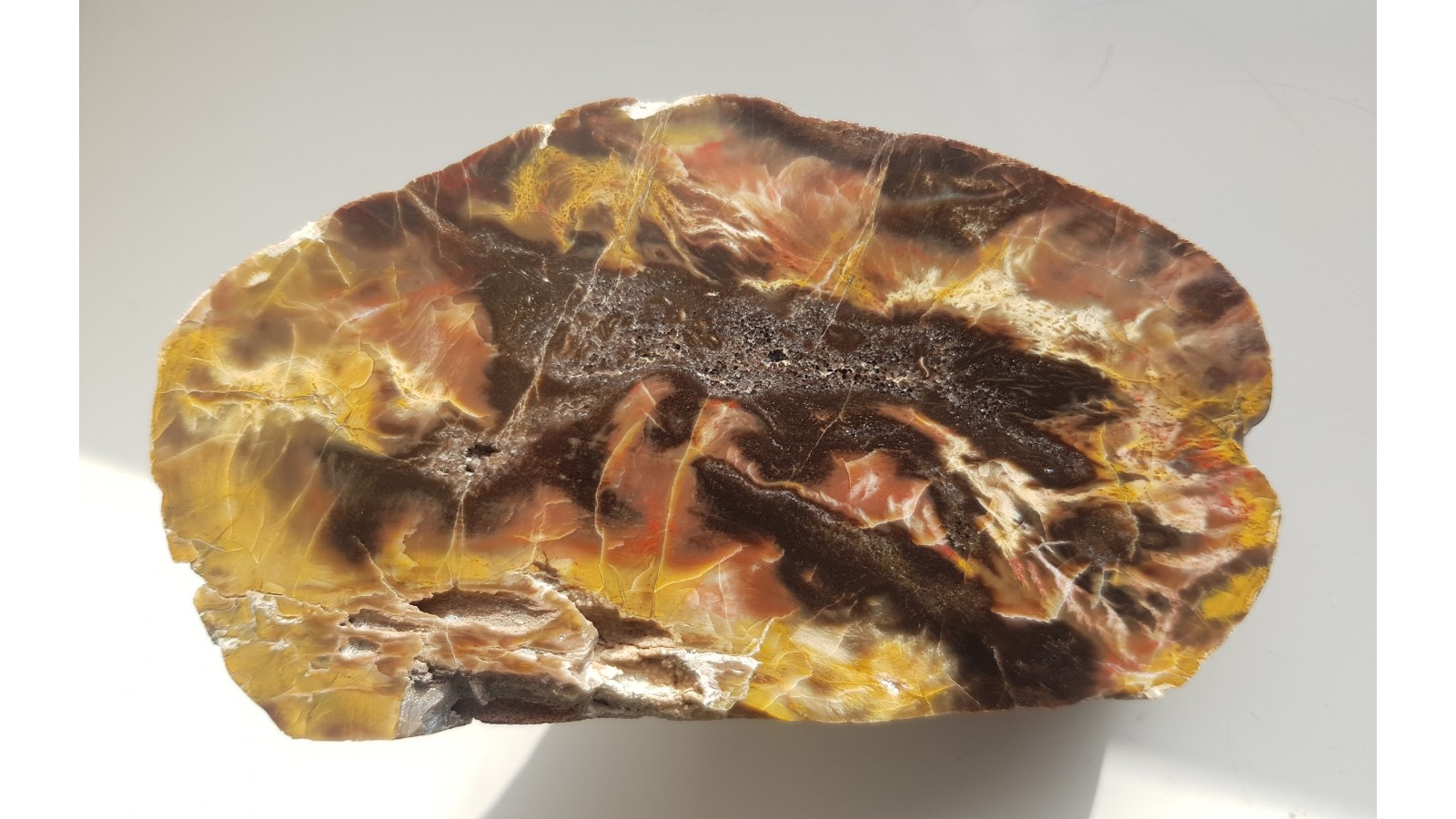 Wyjątkowe drewno skrzemieniałe z niezwykle kontrastowym i atrakcyjnym zabarwieniem. Okaz z aluwiów Nysy Kłodzkiej z okolic Kamieńca Ząbkowickiego. Strona przeciwna naturalna, nie cięta. Wyjątkowy okaz. Polecam.