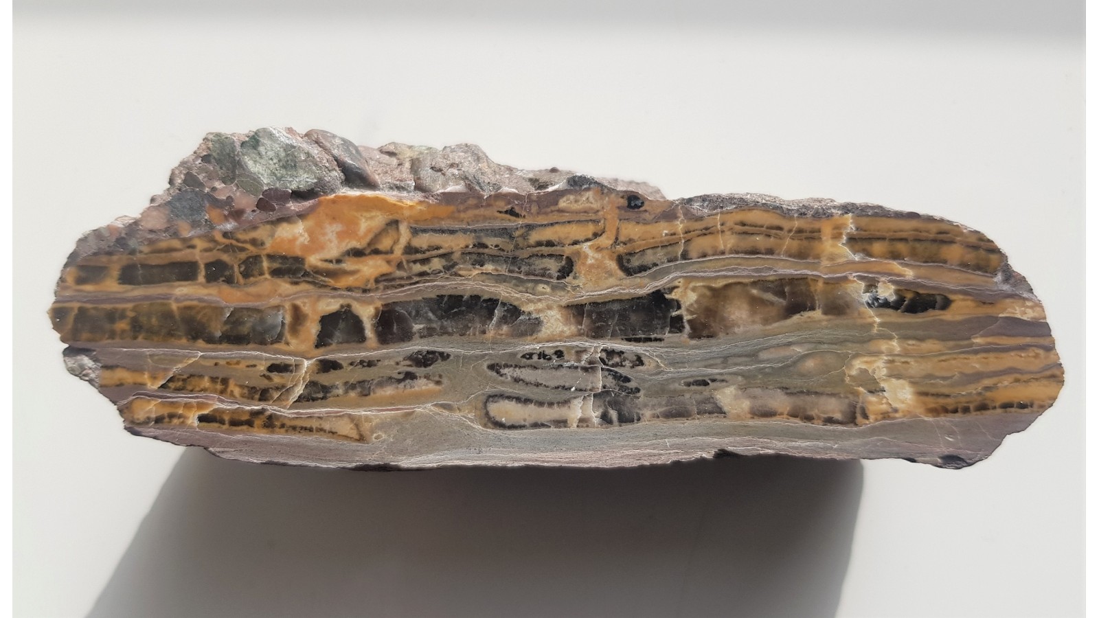 Polerowany okaz warstwowanego rogowca ze Starych Bogaczowic. Okaz ze zlepieńców kulmu (późny dewon, wczesny karbon) z obszaru niecki śródsudeckiej. Rzadko spotykany w materiale okruchowym tych okolic. strona przeciwna naturalna, nie cięta. Idealny poler. Polecam.
