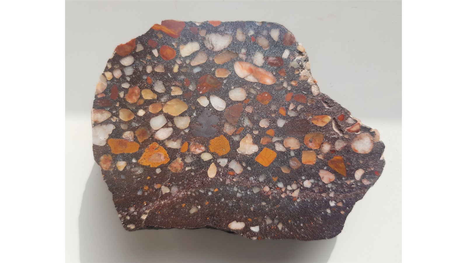 Polerowany okaz żelazistego zlepieńca z okolic Kluczborka. Reprezentuje on skały przełomu trias-jura deponowane w środowisku lądowym. Piękna, masywna i barwna skała z licznymi klastami żółtawoczerownych jaspisów pochodzenia osadowego oraz klastami kwarcowymi. Dobrze wysortowany materiał zlepieńców jest świadectwem dłuższego transportu, zapewne rzecznego. Piękny poler. Skała przełomu trias-jura monokliny przedsudeckiej.