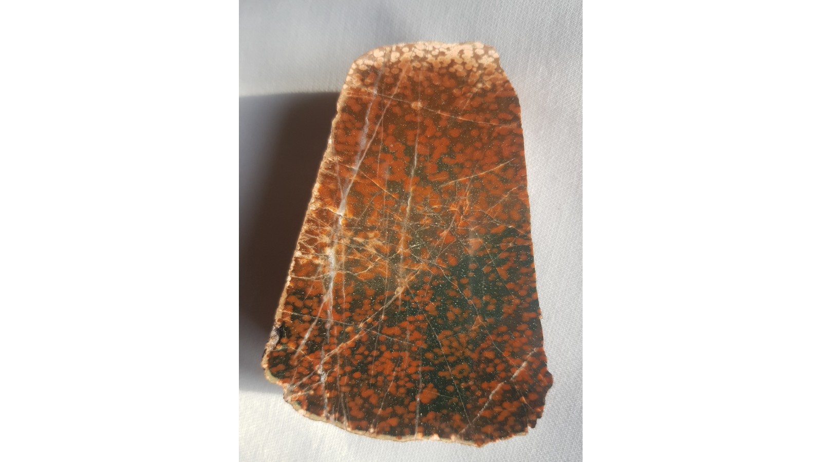 Polerowany okaz adinolu z okolic Kamiennej Góry o bardzo żywych i wyrazistych barwach. Otoczaki tego rodzaju pochodzą ze zlepieńców kulmu (dolny karbon) i są sporadycznie znajdowane na polach w okolicach Kaminej Góry oraz Wałbrzycha. Adinol to skała metamorficzna, powstała na kontakcie skał osadowych oraz skała zasadowych w wyniku oddziaływania związanych z nimi roztworów hydrotermnalnych niosących sód i krzemionkę. Tworzy się w spągu skał wylewnych bądź w pobliżu hipabisalnych żył skał zasadowych. Są to skały twarde, rogowcowe, złożone głównie z kwarcu i albitu. Dawniej były opisywane przez badaczy niemieckich jako heliotropy. Bardzo świeży, niezwietrzały okaz, wyrazisty, nakrapiany i kontrastowy deseń. Strona tylna naturalna, nie cięta. Piękny okaz, świetny poler. Polecam.