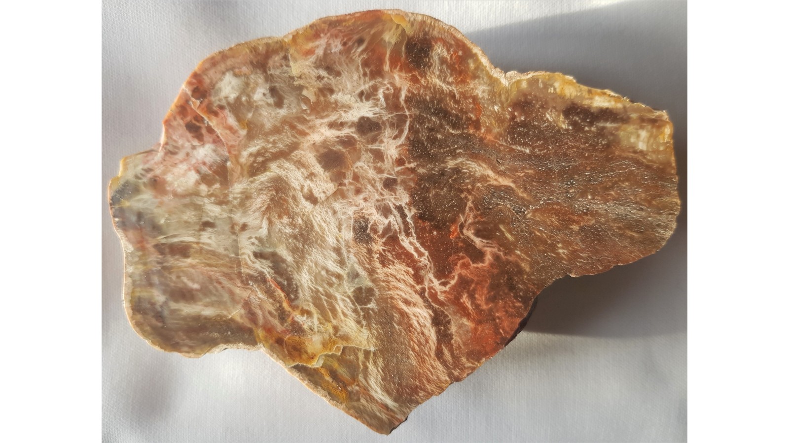 Piękny okaz drewna skrzemieniałego należącego do araukariowatych zwanych obecnie agathoxylon z uwagi na zastępowanie pierwotnej struktury drewna przez chalcedon i agat. Wyjątkowy, barwny okaz drewna skrzemieniałego wieku karbon/perm z aluwiów Nysy Kłodzkiej z okolic Kamieńca Ząbkowickiego. Okaz jednostronnie polerowwany, strona przeciwna bez cięcia, naturalna, idealny poler. Polecam.