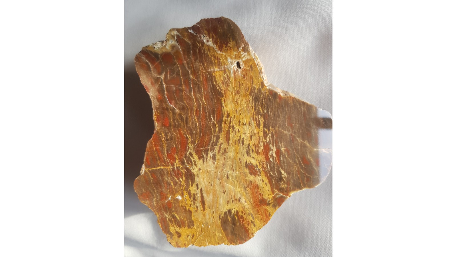 Piękny okaz drewna skrzemieniałego należącego do araukariowatych zwanych obecnie agathoxylon z uwagi na zastępowanie pierwotnej struktury drewna przez chalcedon i agat. Wyjątkowy, barwny okaz drewna skrzemieniałego wieku karbon/perm z aluwiów Nysy Kłodzkiej z okolic Kamieńca Ząbkowickiego. Okaz jednostronnie polerowwany, strona przeciwna bez cięcia, naturalna, idealny poler. Polecam.