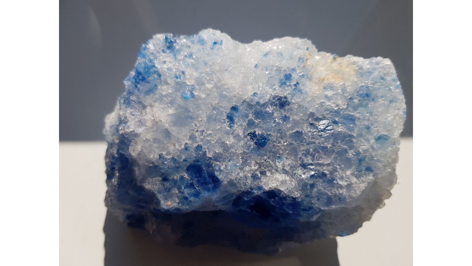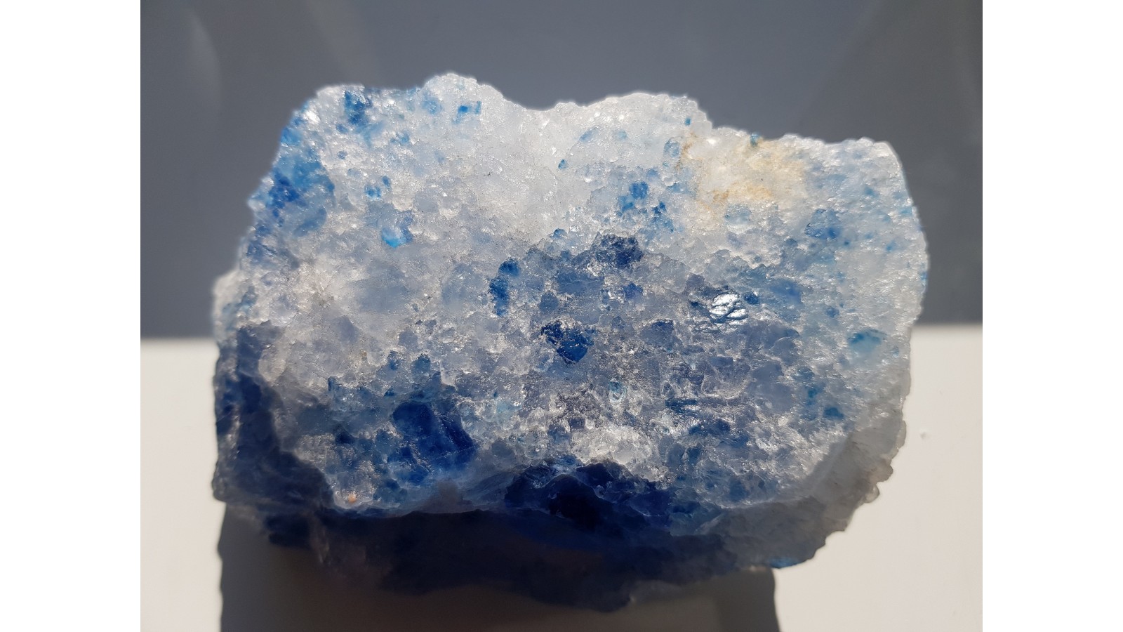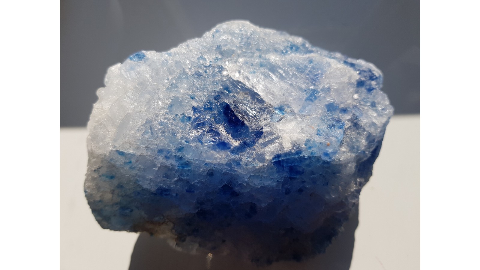 Wyjątkowo intensywnie zabarwiony, spektakularny okaz niebieskiego halitu z kopalni soli w Kłodawie. Okaz z roku 2006, zupełnie niehigroskopijny, bez zmian w stosunku do stanu w jakim został znaleziony. Okaz z permskiego wysadu solnego na Kujawach. Piękny okaz kolekcjonerski. Polecam.