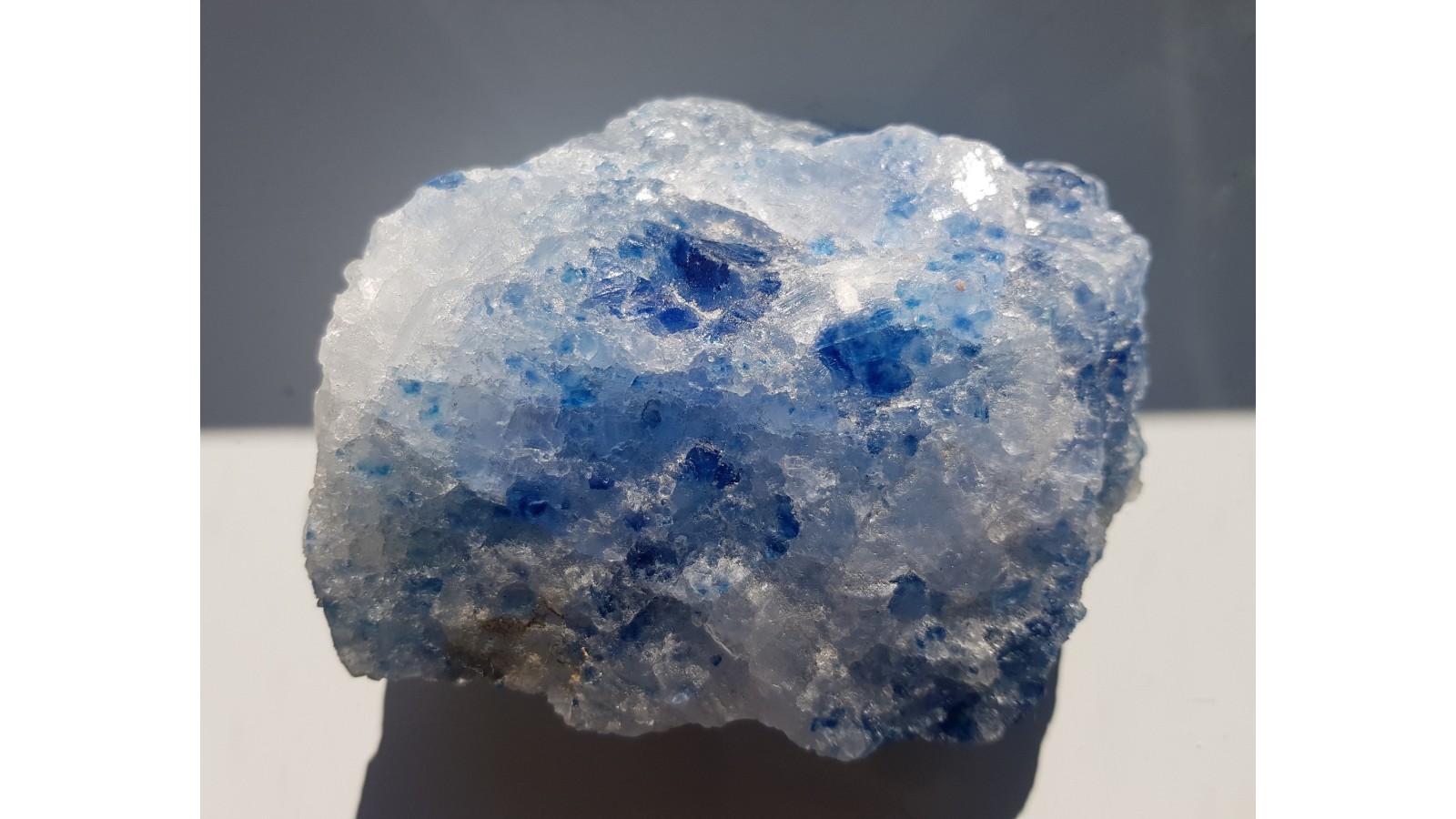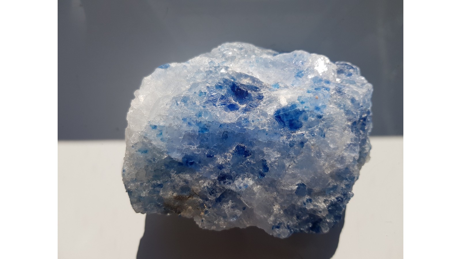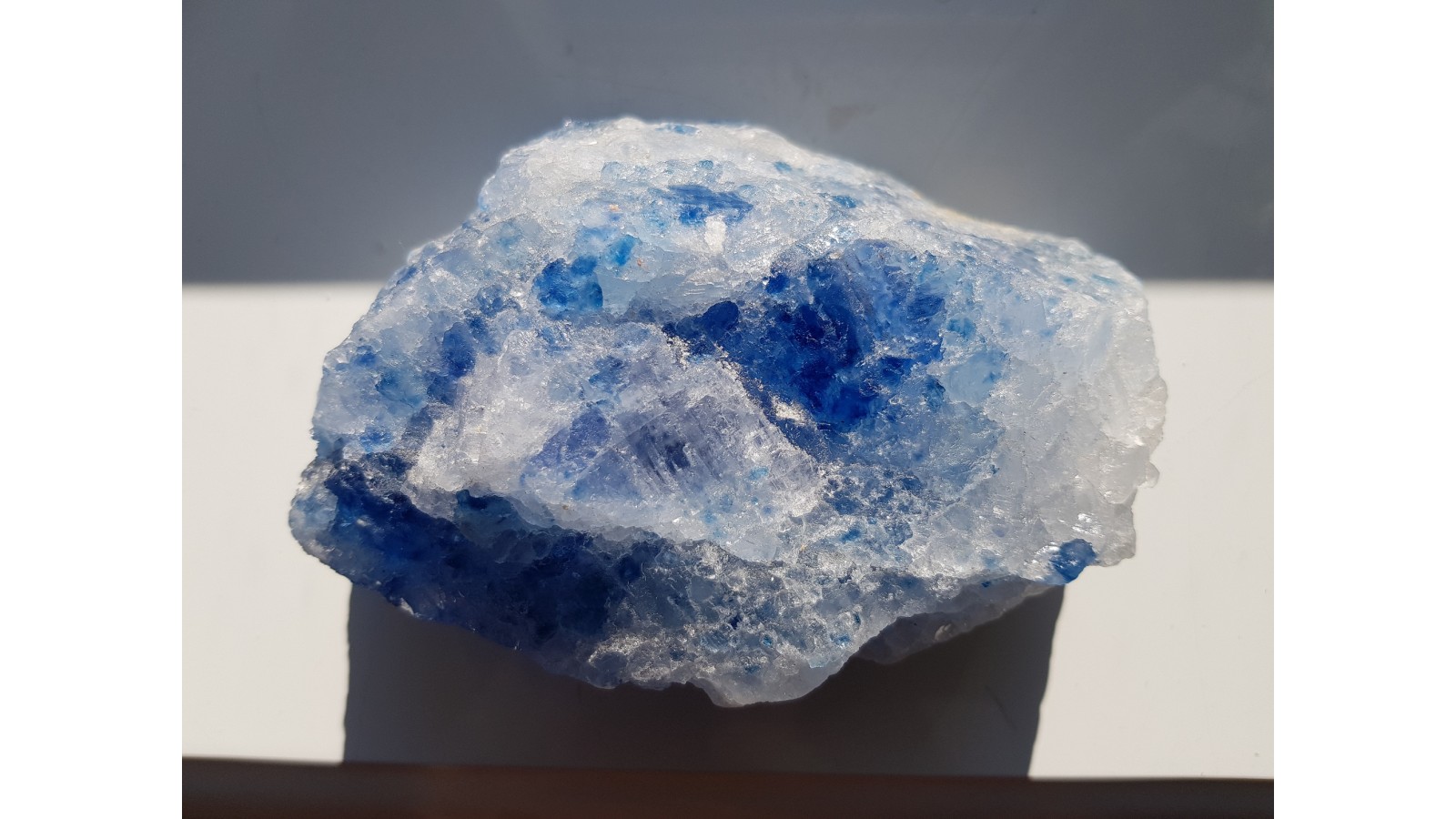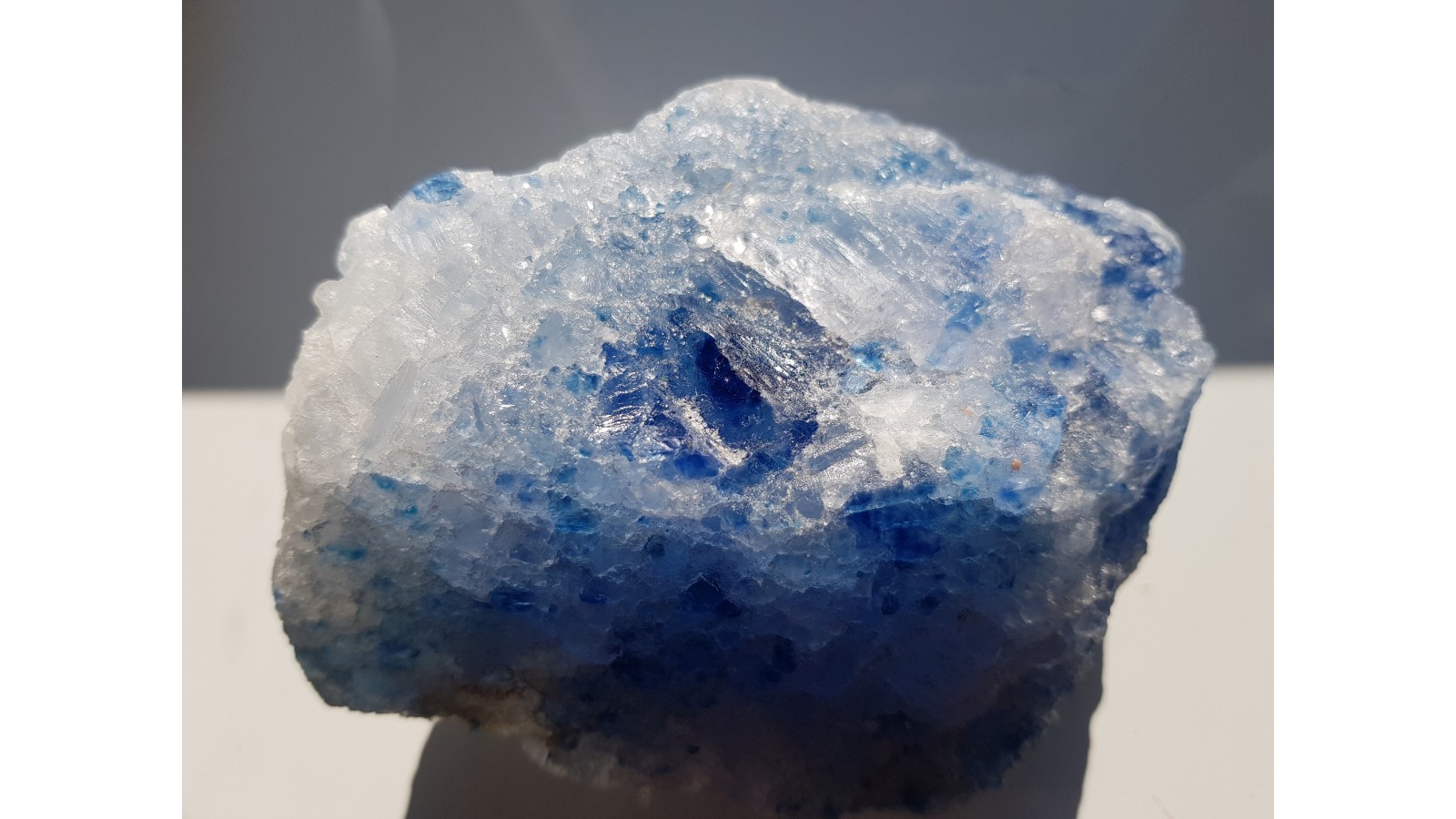 Wyjątkowo intensywnie zabarwiony, spektakularny okaz niebieskiego halitu z kopalni soli w Kłodawie. Okaz z roku 2006, zupełnie niehigroskopijny, bez zmian w stosunku do stanu w jakim został znaleziony. Okaz z permskiego wysadu solnego na Kujawach. Piękny okaz kolekcjonerski. Polecam.