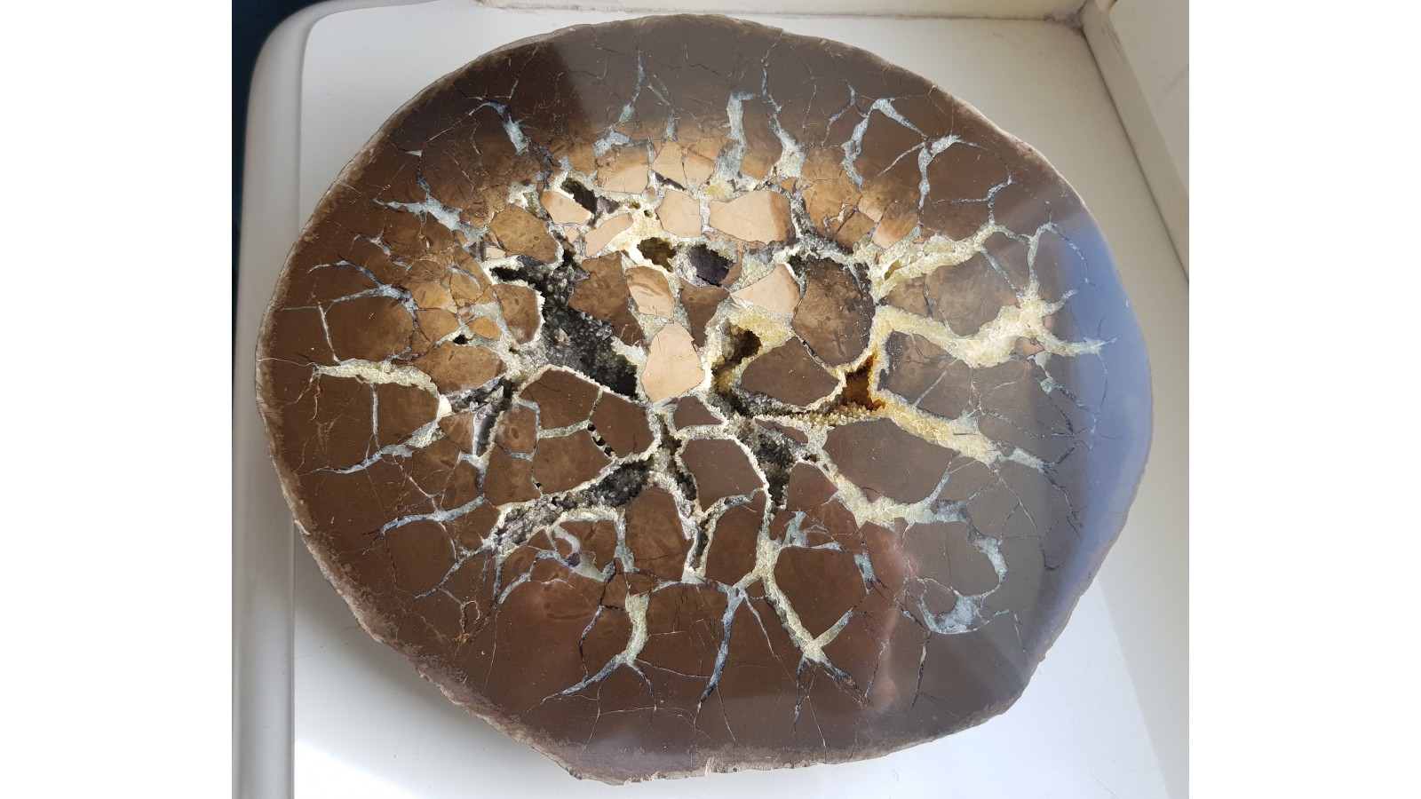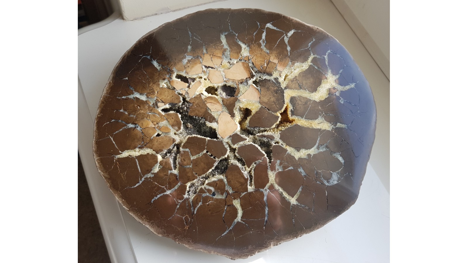 Jurajska konkrecja syderytowa, tzw. sferosyderyt - septaria z Częstochowy. Bardzo okazała, duża, ozdobna, polerowana jednostronnie, z pięknym rysunkiem i bardzo dobrym, jak na sferosyderyty, polerem. Duży okaz. Zamknięta, cała forma, nigdzie nie uszkodzony. W przedwojennej Polsce jurajskie sferosyderyty były eksploatowane pod Częstochową oraz w okolicy Łęczycy jako uboga ruda żelaza. Polecam.
