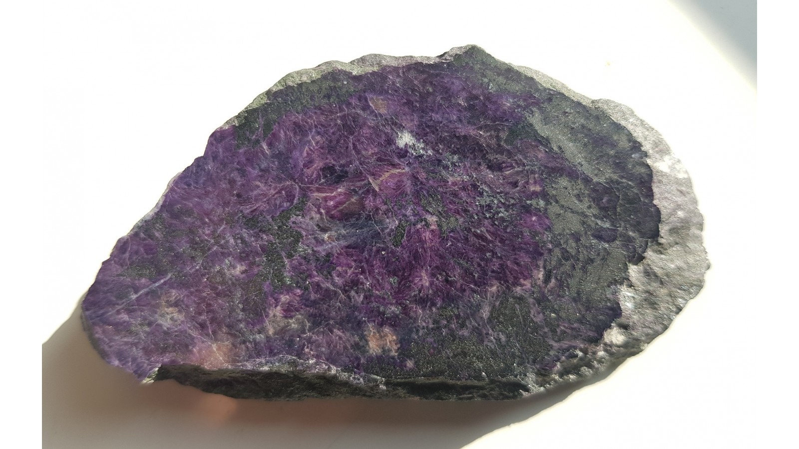 Wyjątkowy dzieki rzadkości występowania i urodzie nie ustępującej czaroitowi - violan - manganowy diopsyd z Włoch. Materiał trudno dostępny. Piękny poler z obydwu stron. Bardzo estetyczny okaz. Polecam.