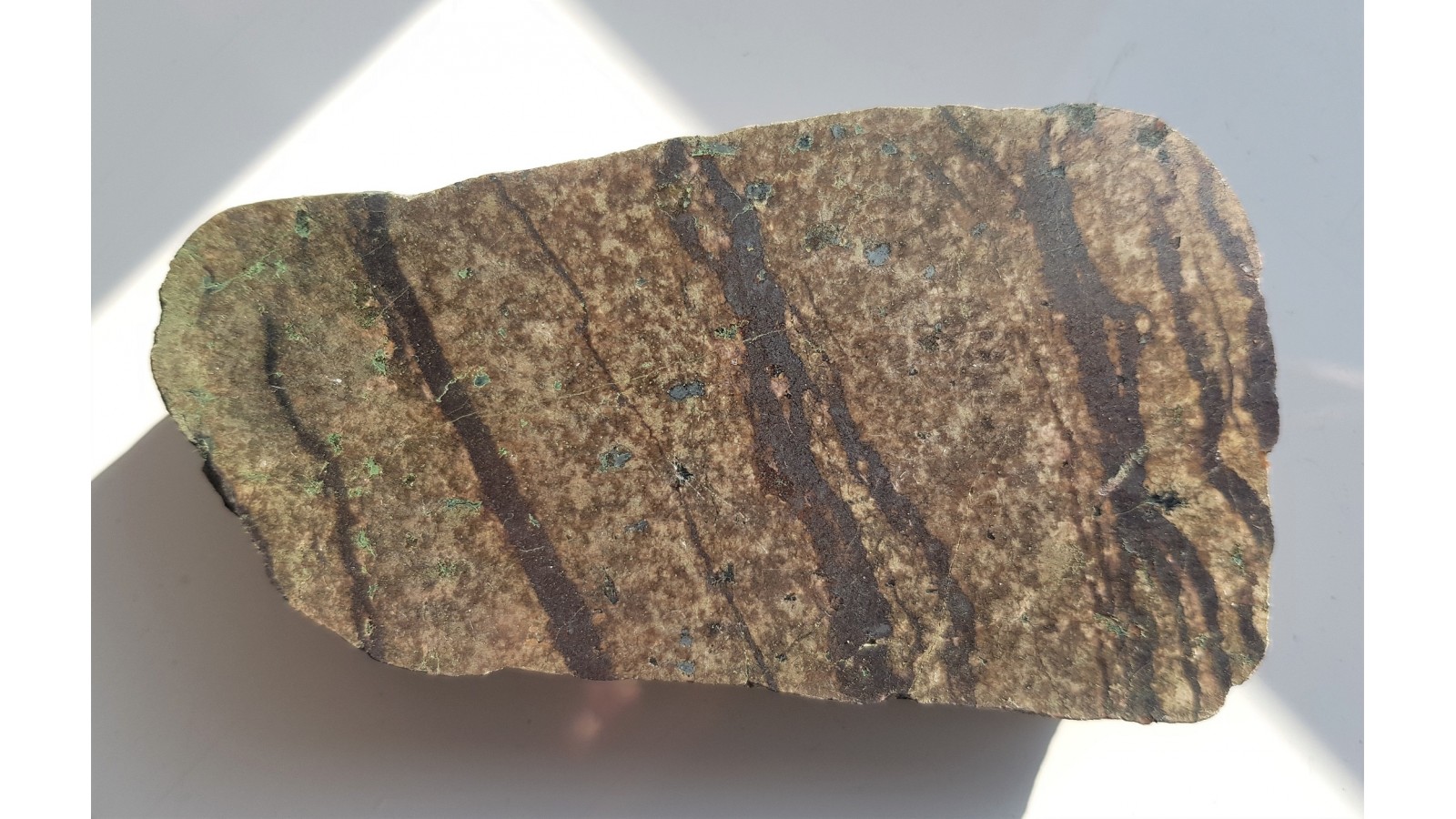 Polerowany okaz zieleńca z żyłami hematytu z kulmu Starych Bogaczowic. Strona przeciwna to naturalny otoczak.